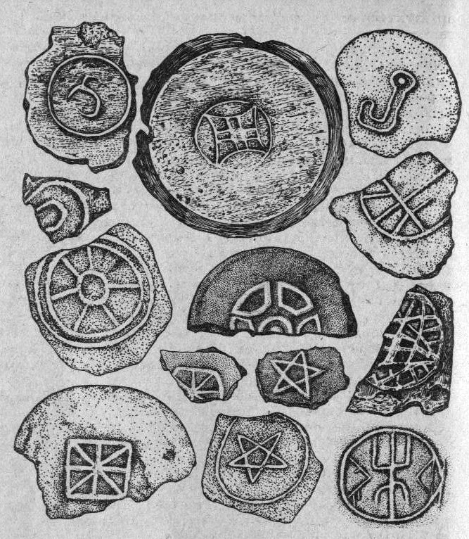 Скачать файл 1 Иллюстрация "Клейма горшков с солярными символами" из книги Даркевича В. П. "Путешествие в древнюю Рязань".Осваиваем способ лепки из глиняного жгута. Лепим декоративный сосуд. Из каких конструктивных элементов состоит сосуд. Говорим об орнаменте и ритме. Украшаем сосуд рельефным геометрическим орнаментом из жгутов.